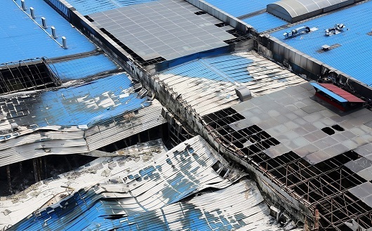 為什們會(huì)這么快就坍塌呢?我們做個(gè)簡(jiǎn)單分析:事發(fā)現(xiàn)場(chǎng)滿目瘡痍,猶如世界末日,從現(xiàn)場(chǎng)我們可以看出,該建筑是由鋼結(jié)構(gòu)為主體加上彩鋼夾芯板作為圍護(hù)建成的一座鋼結(jié)構(gòu)商城,是一個(gè)典型的鋼結(jié)構(gòu)建筑。鋼結(jié)構(gòu)做為一種綠色建筑的代表,不耐火是它的劣勢(shì),也是致命傷,從此次事故現(xiàn)場(chǎng)我們能看到,由于鋼結(jié)構(gòu)柱子受熱已經(jīng)變形扭曲剛度逐漸下降,慢慢失去了承重的能力,因而造成了商場(chǎng)建筑的坍塌。我們還可以看到該建筑的屋頂采用的是巖棉夾芯板,而巖棉的防火性能比較好,基本不燃,所以,主要的火源是商場(chǎng)的貨物。大火炙烤著底部的鋼結(jié)構(gòu)柱子,當(dāng)溫度越高,鋼構(gòu)件的強(qiáng)度就越弱,以至于承受不起屋頂?shù)闹貕憾斐闪丝逅?/p>